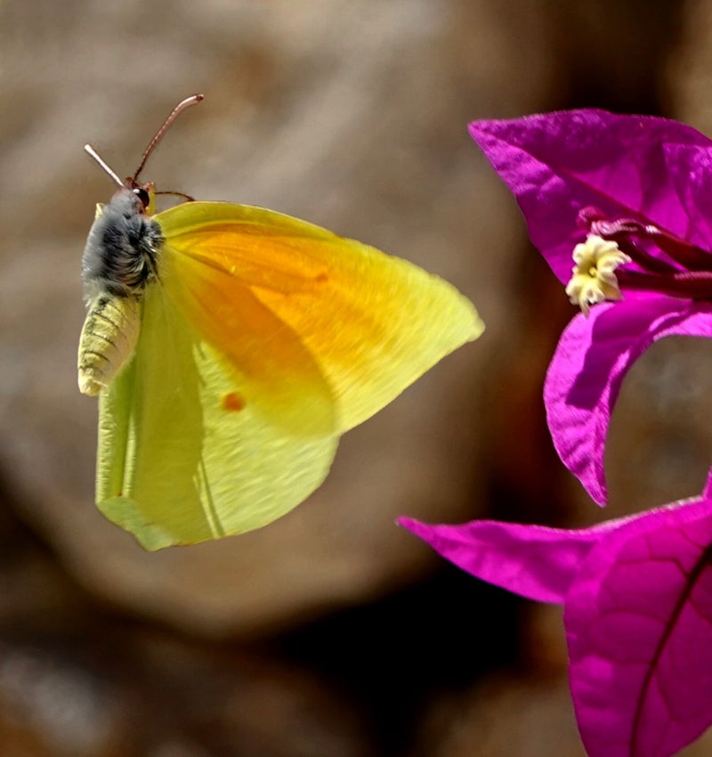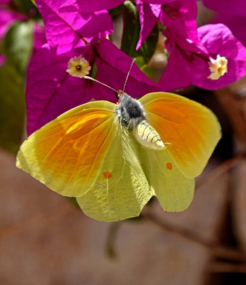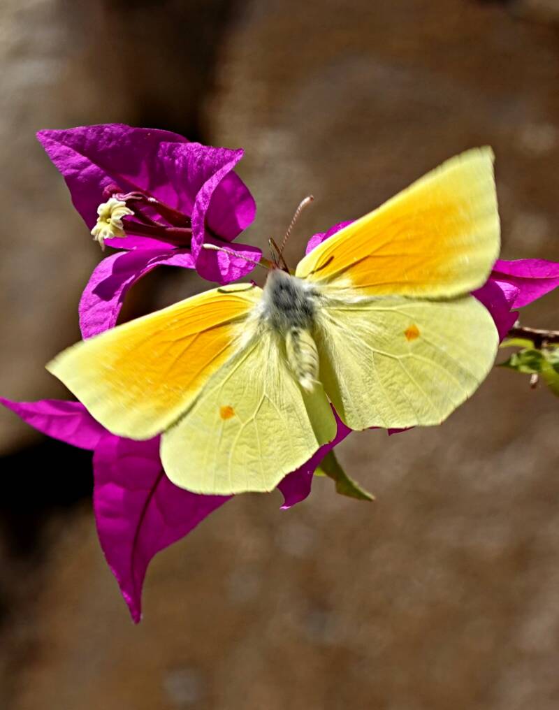 Vlinders heb ik vrijwel uitsluitend op de Ionische Eilanden gefotografeerd. Hier (en bovenaan deze pagina) de oranje-gele Cleopatra vlinder (met opvallend bontmanteltje), die in juni in groten getale aanwezig is op de Bougainville van Paxos. Heel bewegelijk en dus lastig te fotograferen.